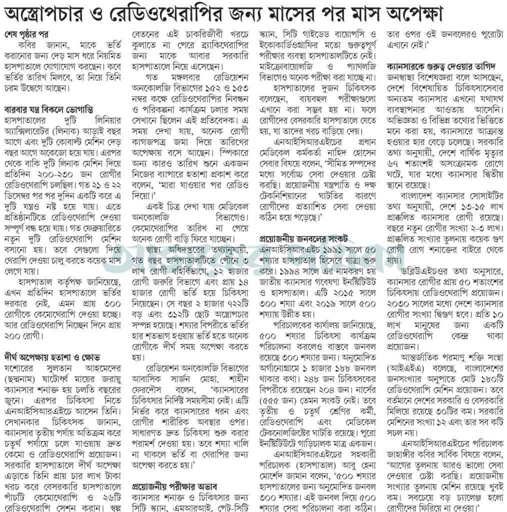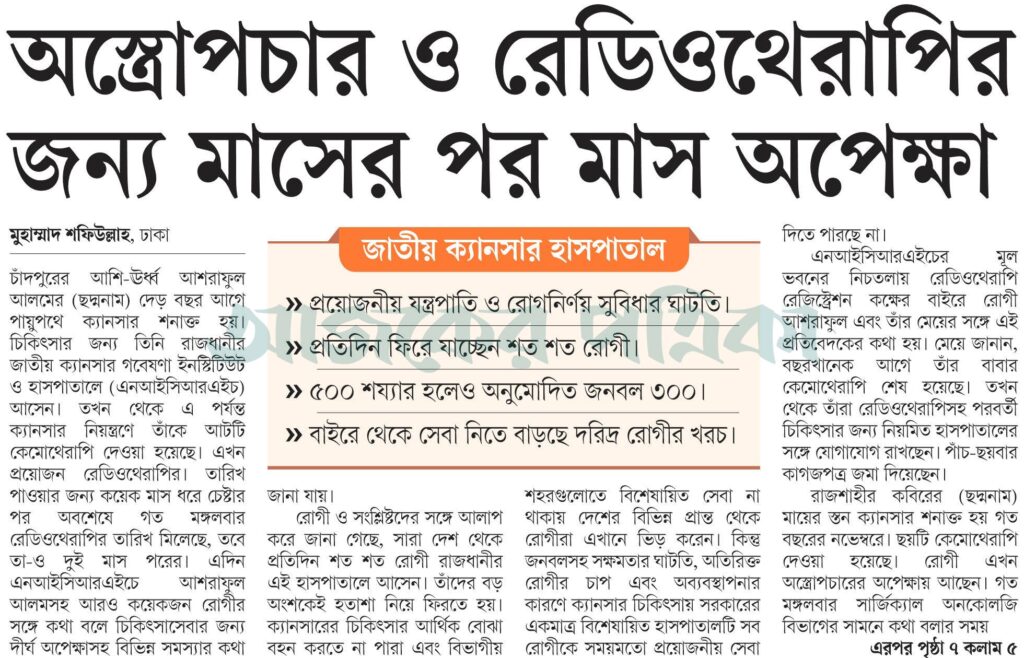 চাঁদপুরের আশি-ঊর্ধ্ব আশরাফুল আলমের (ছদ্মনাম) দেড় বছর আগে পায়ুপথে ক্যানসার শনাক্ত হয়। চিকিৎসার জন্য তিনি রাজধানীর জাতীয় ক্যানসার গবেষণা ইনস্টিটিউট ও হাসপাতালে (এনআইসিআরএইচ) আসেন। তখন থেকে এ পর্যন্ত ক্যানসার নিয়ন্ত্রণে তাঁকে আটটি কেমোথেরাপি দেওয়া হয়েছে। এখন প্রয়োজন রেডিওথেরাপির। তারিখ পাওয়ার জন্য কয়েক মাস ধরে চেষ্টার পর অবশেষে গত মঙ্গলবার রেডিওথেরাপির তারিখ মিলেছে, তবে তা-ও দুই মাস পরের। এদিন এনআইসিআরএইচে আশরাফুল আলমসহ আরও কয়েকজন রোগীর সঙ্গে কথা বলে চিকিৎসাসেবার জন্য দীর্ঘ অপেক্ষাসহ বিভিন্ন সমস্যার কথা জানা যায়।