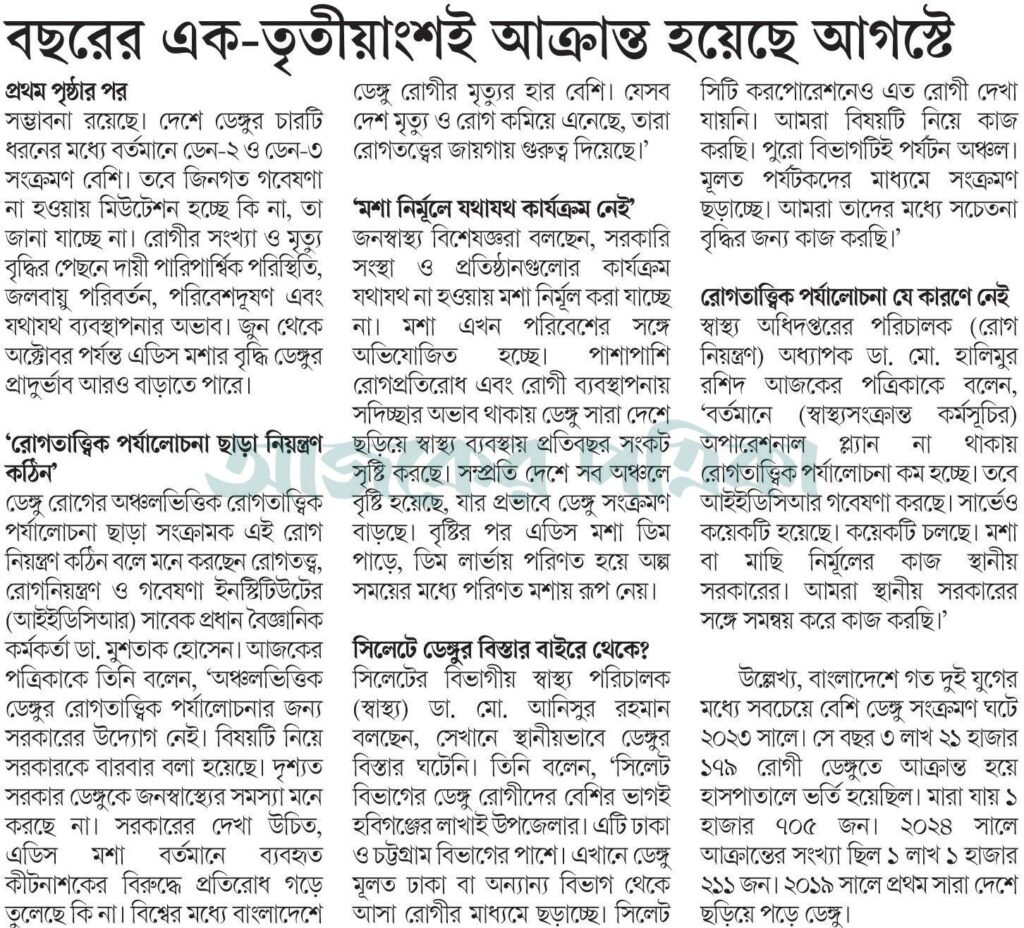 ডেঙ্গু রোগের অঞ্চলভিত্তিক রোগতাত্ত্বিক পর্যালোচনা ছাড়া সংক্রামক এই রোগ নিয়ন্ত্রণ কঠিন বলে মনে করছেন রোগতত্ত্ব, রোগনিয়ন্ত্রণ ও গবেষণা ইনস্টিটিউটের (আইইডিসিআর) সাবেক প্রধান বৈজ্ঞানিক কর্মকর্তা ডা. মুশতাক হোসেন। আজকের পত্রিকাকে তিনি বলেন, ‘অঞ্চলভিত্তিক ডেঙ্গুর রোগতাত্ত্বিক পর্যালোচনার জন্য সরকারের উদ্যোগ নেই। বিষয়টি নিয়ে সরকারকে বারবার বলা হয়েছে। দৃশ্যত সরকার ডেঙ্গুকে জনস্বাস্থ্যের সমস্যা মনে করছে না। সরকারের দেখা উচিত, এডিস মশা বর্তমানে ব্যবহৃত কীটনাশকের বিরুদ্ধে প্রতিরোধ গড়ে তুলেছে কি না। বিশ্বের মধ্যে বাংলাদেশে ডেঙ্গু রোগীর মৃত্যুর হার বেশি। যেসব দেশ মৃত্যু ও রোগ কমিয়ে এনেছে, তারা রোগতত্ত্বের জায়গায় গুরুত্ব দিয়েছে।’
