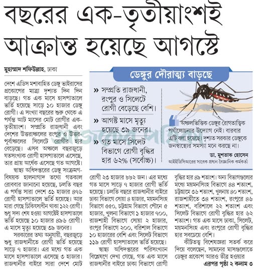 দেশে এডিস মশাবাহিত ডেঙ্গু ভাইরাসের প্রকোপের মাত্রা দৃশ্যত দিন দিন বাড়ছে। গত এক মাসে হাসপাতালে ভর্তি হয়েছে সাড়ে ১০ হাজার ডেঙ্গু রোগী। এ সংখ্যা বছরের শুরু থেকে এ পর্যন্ত আট মাসের মোট রোগীর এক-তৃতীয়াংশ। সম্প্রতি রাজধানী এবং দেশের উত্তরাঞ্চলের রংপুর ও উত্তর-পূর্বাঞ্চলের সিলেটে রোগীর হার বেড়েছে। এসব অঞ্চলে বছরজুড়ে যতসংখ্যক রোগী হাসপাতালে এসেছে, তার প্রায় অর্ধেক এসেছে গত আগস্টে।
