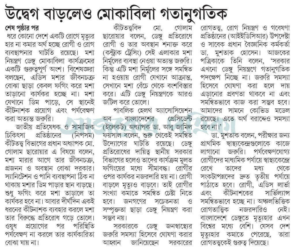 পাবলিক হেলথ অ্যাসোসিয়েশন অব বাংলাদেশের প্রেসিডেন্ট (ইলেকট) অধ্যাপক ডা. আবু জামিল ফয়সাল বলেন, শুরু থেকেই সমন্বিত উদ্যোগের ঘাটতি রয়েছে। ডেঙ্গু প্রতিরোধের দায়িত্ব স্থানীয় সরকার বিভাগের হলেও তাদের কার্যক্রম মূলত ফগিংয়ের মধ্যে সীমাবদ্ধ। রোগীর ওপর কার্যকর নজরদারি হয় না। রোগী বাড়লে মৃত্যুও বাড়বে। তাই রোগীর সংখ্যা কমাতে সমন্বিত চেষ্টা নিতে হবে। জনগণের সচেতনতা ও সম্পৃক্ততা ছাড়া ডেঙ্গু নিয়ন্ত্রণ করা সম্ভব নয়।