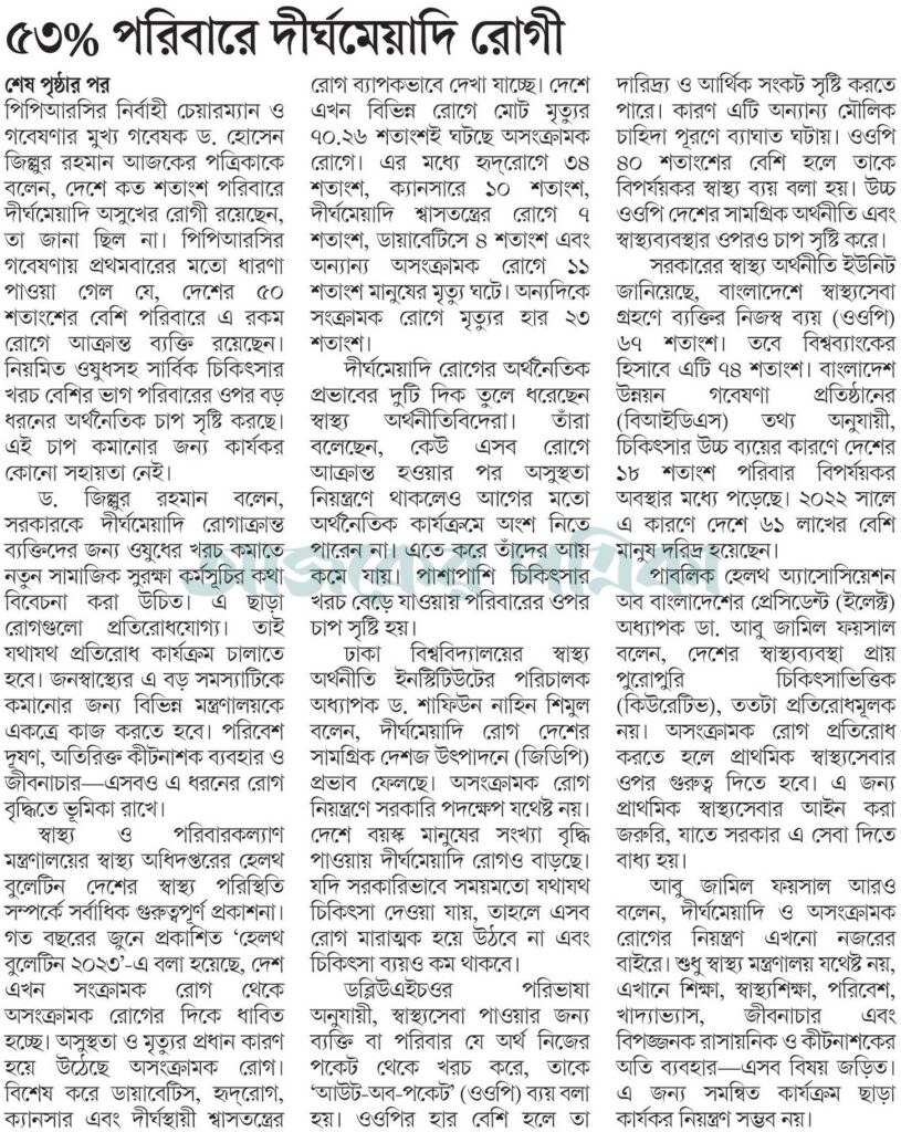 দেশের মানুষের দীর্ঘমেয়াদি ও অসংক্রামক রোগে আক্রান্ত হওয়ার হার ক্রমেই বাড়ছে। প্রতিবছর যত মানুষের মৃত্যু হচ্ছে, তার দুই-তৃতীয়াংশের বেশি মারা যাচ্ছেন এসব রোগের কারণে। সাম্প্রতিক এক গবেষণায় উঠে এসেছে, দেশের প্রায় ৫৩ শতাংশ পরিবারের অন্তত একজন সদস্য কোনো দীর্ঘমেয়াদি রোগে আক্রান্ত। বড় রোগের এ বোঝা চিকিৎসার জন্য রোগীর নিজের ব্যয় বাড়িয়ে দিচ্ছে, যাকে বিশেষজ্ঞরা বলেন, আউট-অব-পকেট এক্সপেনডিচার বা ওওপি। জাতীয় স্বাস্থ্য ব্যবস্থাপনা তথা অর্থনীতিতে বিরূপ প্রভাব ফেলছে এ বিষয়টি।