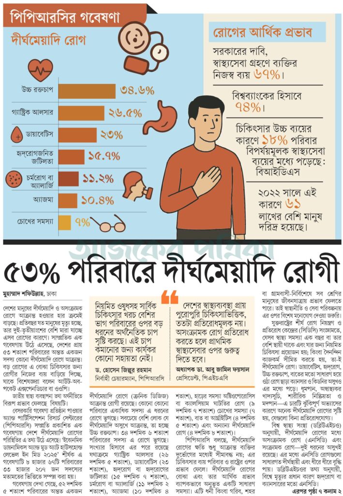 বেসরকারি গবেষণা প্রতিষ্ঠান পাওয়ার অ্যান্ড পার্টিসিপেশন রিসার্চ সেন্টারের (পিপিআরসি) সম্প্রতি প্রকাশিত এক গবেষণায় দেশে দীর্ঘমেয়াদি রোগের পরিস্থিতির এ তথ্য উঠে এসেছে। ‘ইকোনমিক ডায়নামিকস অ্যান্ড মুড অ্যাট হাউসহোল্ড লেভেল ইন মিড ২০২৫’ শীর্ষক এ গবেষণাটি ৮ হাজার ৬৭টি পরিবারের ৩৩ হাজার ২০৭ জন সদস্যের মতামতের ভিত্তিতে সম্পন্ন করা হয়।
