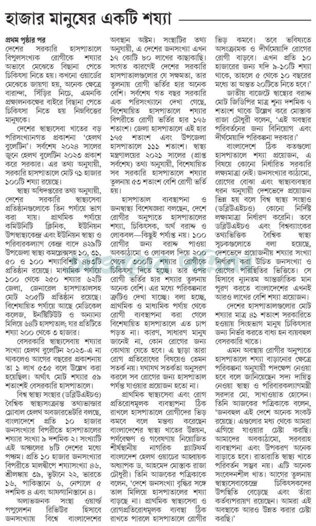 প্রাথমিক স্বাস্থ্যসেবা এবং রোগ প্রতিরোধমূলক ব্যবস্থাপনা ঠিক রাখলে হাসপাতালে রোগীদের ভিড় কমবে বলে মন্তব্য করেছেন বাংলাদেশের স্বাস্থ্য খাতের উন্নয়ন, পর্যবেক্ষণ ও গবেষণায় নিয়োজিত শীর্ষস্থানীয় নাগরিক প্ল্যাটফর্ম বাংলাদেশ হেলথ ওয়াচের আহ্বায়ক অধ্যাপক ড. আহমেদ মোস্তাক রাজা চৌধুরী। তিনি আজকের পত্রিকাকে বলেন, ‘দেশে জনসংখ্যা বৃদ্ধির সঙ্গে তাল মিলিয়ে হাসপাতালের শয্যা বাড়ছে না। প্রাথমিক স্বাস্থ্যসেবা ও রোগপ্রতিরোধমূলক ব্যবস্থা ঠিক রাখতে পারলে হাসপাতালে রোগীর ভিড় কমবে। তবে ভবিষ্যতে অসংক্রামক ও দীর্ঘমেয়াদি রোগের রোগী বাড়বে। এখন প্রতি ১০ হাজারের জন্য যদি ৯-১০টি শয্যা থাকে, তাহলে ৫ থেকে ১০ বছরের মধ্যে তা অন্তত ২০টিতে নিতে হবে।’